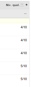 C’est ce qu’il appelle le Quality Score (score de qualité). Il s’agit d’une note comprise entre 0 et 10 comme à l’école primaire. Cette note est attribuée à chacun de vos mots clés: - Entre 0 et 6, on considérera que la qualité est mauvaise - 7 est une note correcte - 8 et 9 très bonne - 10 excellente